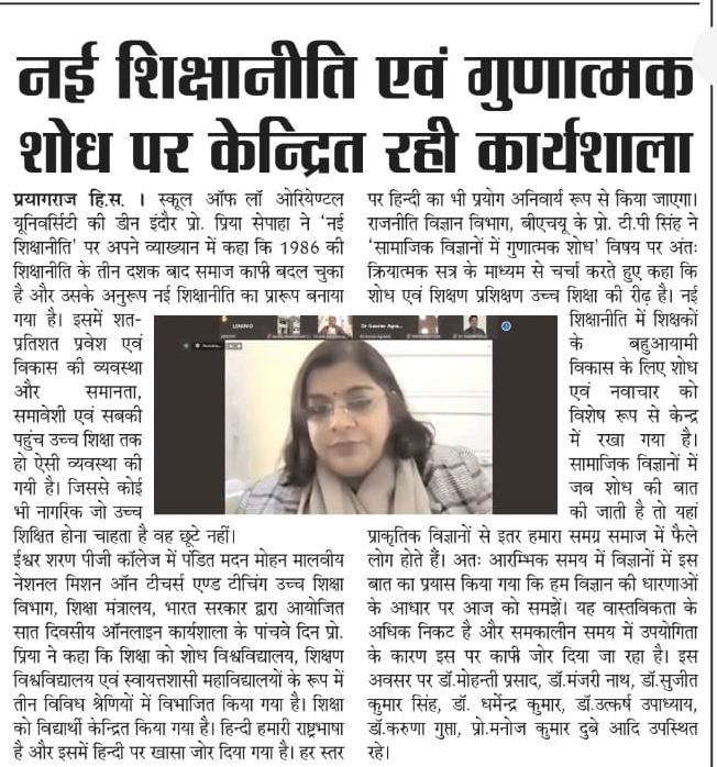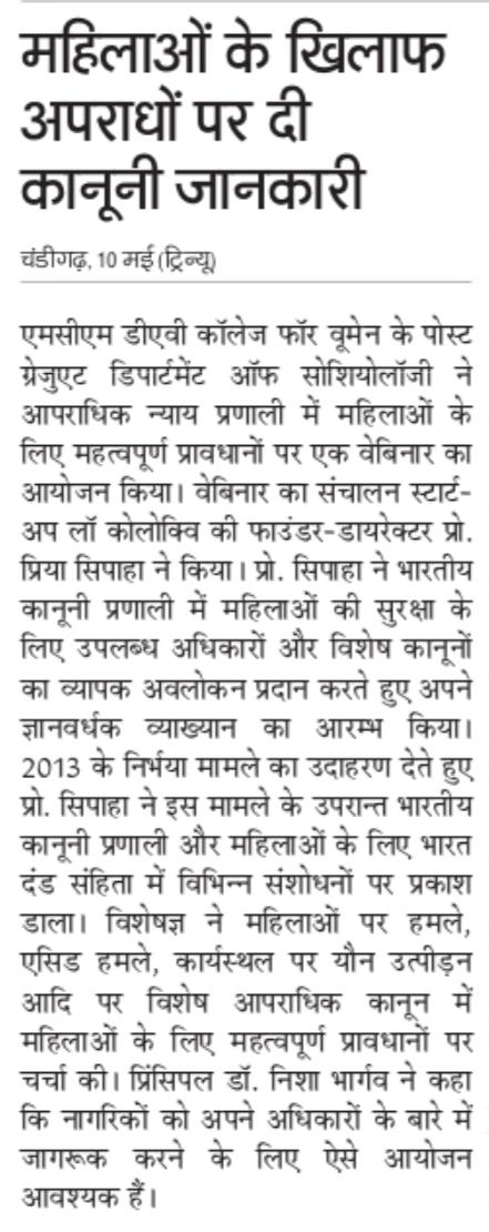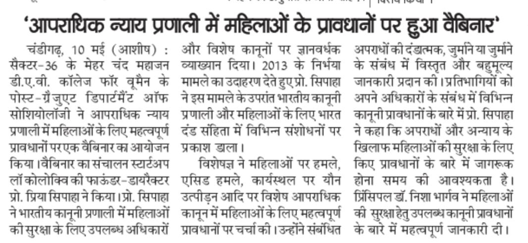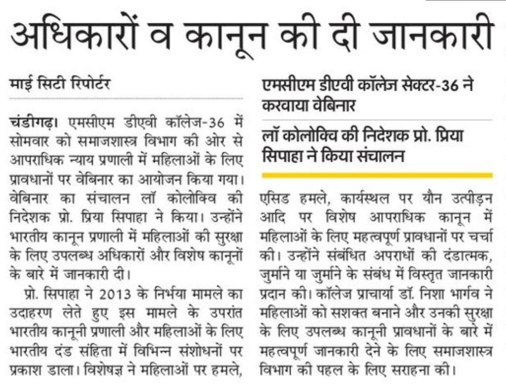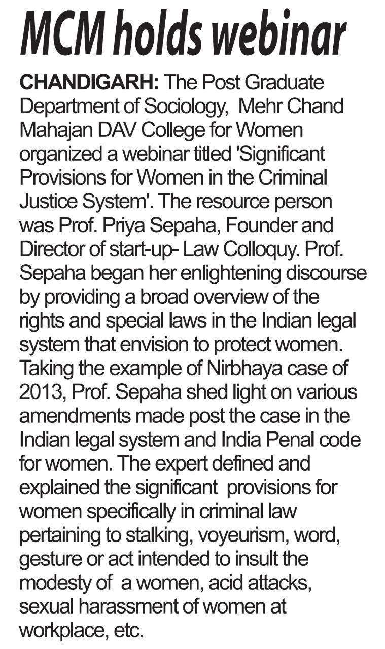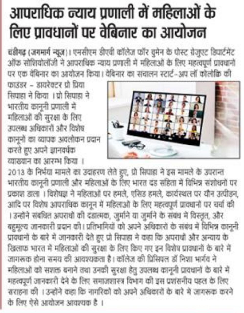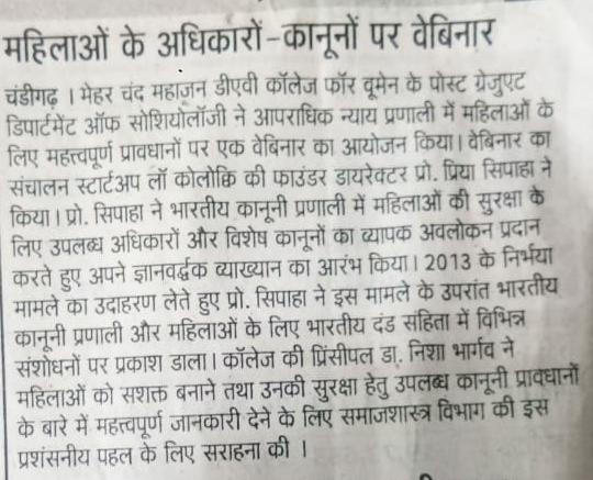 Prof. (Dr) Priya Sepaha was invited as a resource person in the webinar at MSM, DAV Colege Chandigarh.